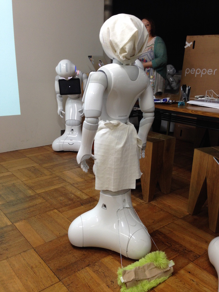 割烹着を着たPepperの後ろにモップがつけられています。Pepperは「どいて、どいてー」としゃべりながら動き回り、障害物を見つけたら転回して床掃除をします。動きを止めたいときは、Pepperの頭を触ります。
