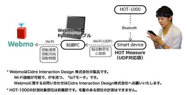 「HOT-1000」をおでこのあたりに装着して、前額部の生体信号を用いた ニューロフィードバックにより、 Webmoの左右のモーター回転を制御できるとしています。また心拍数の値をモーターに反映させることも可能です。