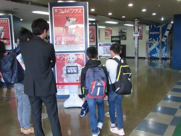 モノマネPepperは、ライオンズストアの目の前にいるPepperに導入されている。ここは、特に休日の試合前などとても混み合う場所で、会計待ちのお客の列ができる場所だ。