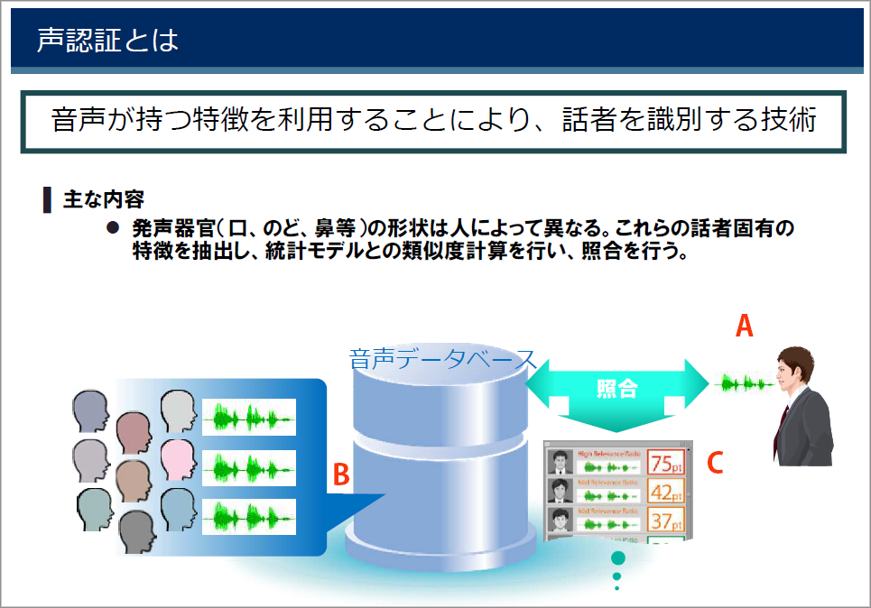 今回は「声認証」を中心に、まずは基本からお伺いしたいと思います。声認証とはどのような技術なのでしょうか。