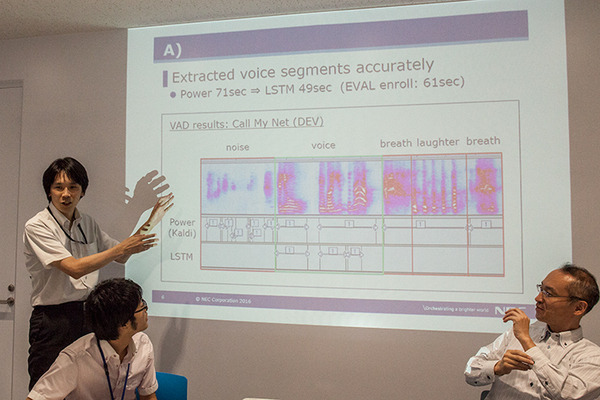おっしゃるとおりです。携帯電話の音声は各種コーデック(圧縮技術)が使われていますし、アナログ電話であれば雑音やノイズが入ります。しかし、実はその点の解析にもディープラーニングをはじめとした機械学習を使っています。例えば、機械学習時にクリアな声、携帯電話の声、アナログ電話の声、インターホン越しの声など、様々な状況の声のデータをそれぞれたくさん解析させます。そうすると、声認証システムは携帯電話のコーデックがかかっている音声の場合は実際の声とはこのように変わる、ということを特徴量で識別できるようになります。こうして学習してしまえば、解析すべき音声がどのような機器を通して聞こえてきた声かを自動で推察し、その結果、高精度の判定ができるようになります。このようにお客様の環境にあわせてエンジンレベルでの最適化を行うことができるのもNECならではの強みといえます。