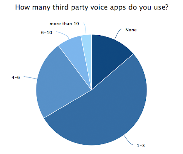 サードパーティー製スキルについて、約53%が1~3スキル、23%が4~6スキルを使うことがわかった。逆に14%はサードパーティースキルを使っていないと回答している。現在Amazon Alexaのスキルは24,000を超える状況にあるが、そのスキルの多さを一般ユーザーは活用しきれていないことがわかる。
