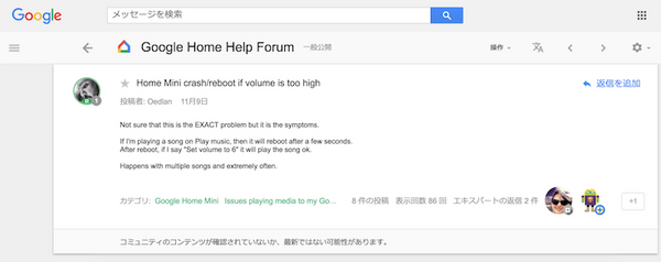 続いてRedditでも同様の問題が報告されている。最大音量で5~10秒後にGoogle Home Miniがクラッシュし再起動してしまうという。