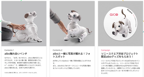 aiboと触れあうことができ、一緒に写真を撮ることもでき、さらにソーシャルでシェアすることで、aibo限定グッズ(2週間毎にかわるステッカー!)がもらえるというもの。