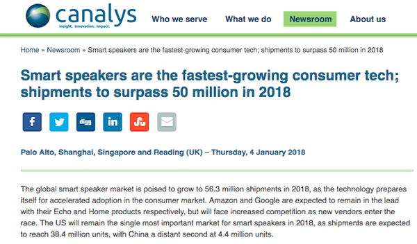 米市場調査会社Canalysがスマートスピーカーについての調査結果を発表した。