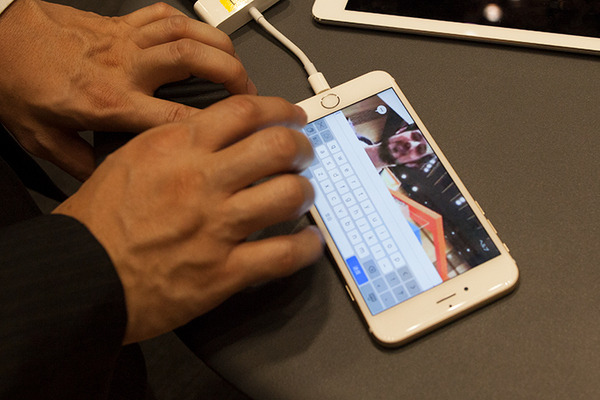 Pepperを遠隔操作できるのは、Pepperと連携したiPhone、またはiPad。Pepperを前後左右に移動させることができるだけでなく、スマートフォン等で入力した文字をPepperにしゃべらせることもできる。
