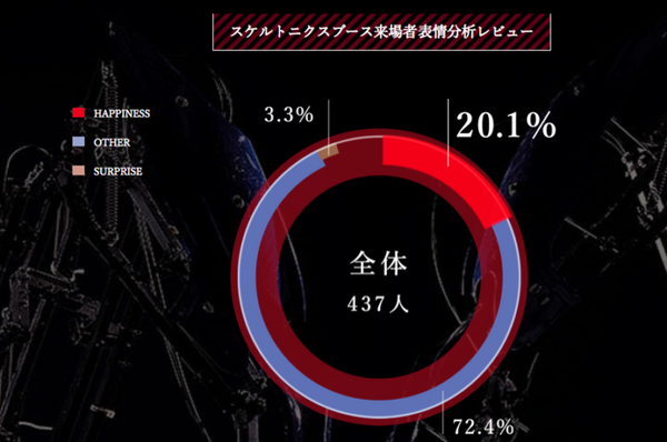 また「スケルトニクス」の搭乗体験のイベントでは、来場者(437人)がブースに滞在した総時間中、約2割の時間を幸せな表情で占めていたというユニークなデータが算出されていた。これは同調査における遊園地や温泉をも上回る数値であり、「スケルトニクス」の「幸せな気持ちにする力」が立証されている。