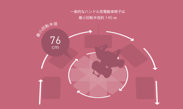従来の電気車椅子は回転半径つまり回る時に約145cm必要だったが「WHILL Model C」では76cmと小回りがしやすくなった。