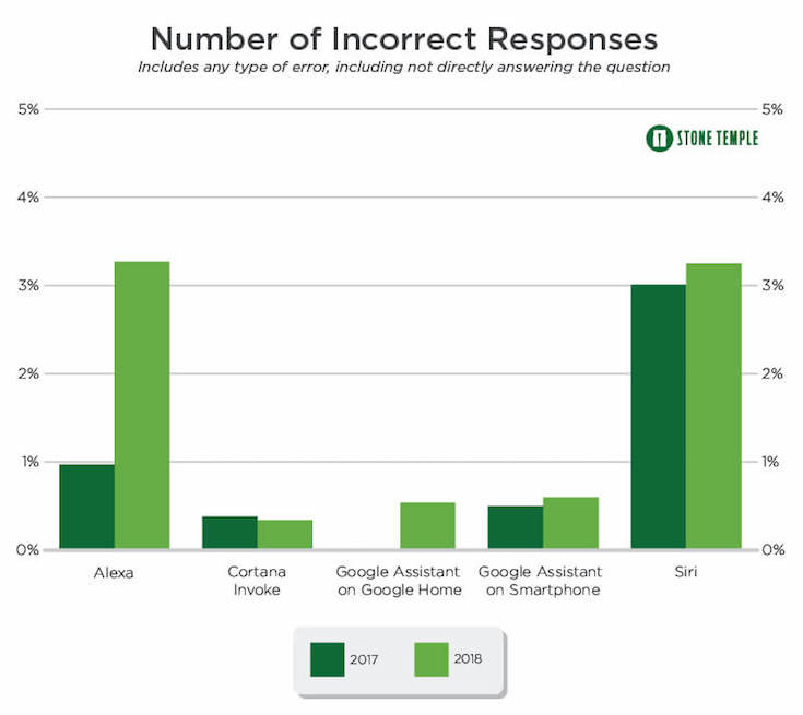 不正解率を2017年と2018年で比較すると、Alexaの不正解率が上昇、Siriも微増。