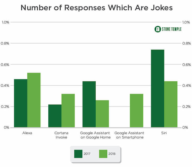 ジョークをいう率を2017年と2018年で比較。ジョークを言うのはAlexa。Siriはジョーク率が減少した。
