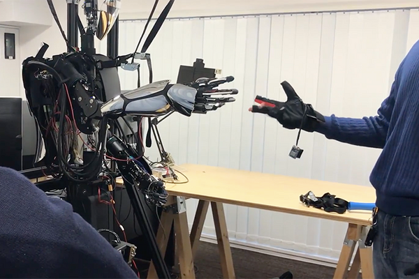 グローブを装着した粕谷氏が指を動かすと、それに反応してアバターロボットも同じ指を動かします。本来なら、腕の装着具も装備して使用しますが、今回はセットアップの都合上、肩から腕にかけての動作は指のグローブとは別に操作していますが、動画では連動している様子がおわかり頂けると思います。腕と指の「柔らかな動き」にも注目してください。