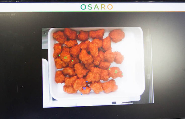 注目はAIビジョンを使った唐揚げのピッキング作業。昨年に開催された国際ロボット展でもお弁当のピッキングのデモンストレーションは行われていたのですが、今回はそれに加え不定形でばら積みされた唐揚げの形状を認識してピッキングしてお弁当に乗せていくといったもの。