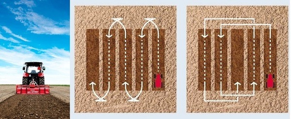 直進モードイメージ(左):前進・後退・停止を駆使して、一列ずつ精密に作業/オートモードイメージ(右):後退・停止は使わずに前進のみで作業。旋回時はノーブレーキなので枕地を荒らさず作業が可能