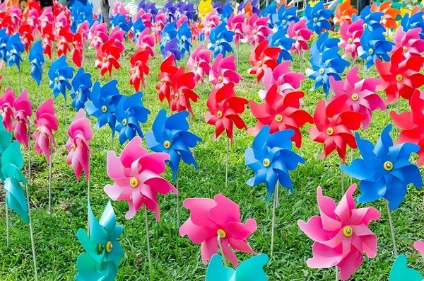アイデアを形にできる IoT ブロック「MESH」の、動きを検知することができる“動きタグ”がついたうちわをあおぐと、その動きに反応して信号が送られ、扇風機が動きます。そして、その扇風機の風によって、大量かつ色とりどりのかざぐるまが回りだし、併せて設置されたワイヤレスポータブルスピーカーが別のタグに反応し、太鼓などの音と光を放つ。うちわをあおぐ強さで風、音、光を操りながら遊ぶことができるスポットだ。