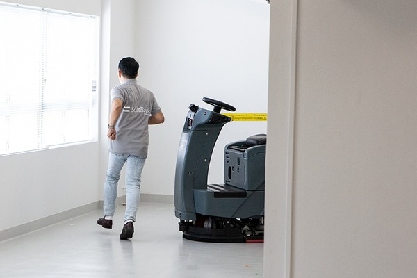 「RS26」はソフトバンクロボティクスが次世代の自律走行式と位置づける、大型のスクラバー。綺麗な水を床に吹き付けてブラッシングし、汚れた水を負圧で吸い上げるシステムだ。