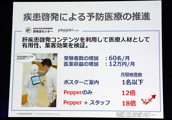 佐賀大学の肝疾患センターでは、肝疾患啓発コンテンツを利用して、Pepperが肝炎の予防や検診の啓発を行った。それまでは検診を薦めるポスター掲示を行っていたが、ほとんど反応がなく、検査受診者は月間にすると平均1名以下だったが、Pepperが啓発を行ってからは12倍に、Pepperとスタッフの両方が啓発を行うと18倍に向上したと言う。