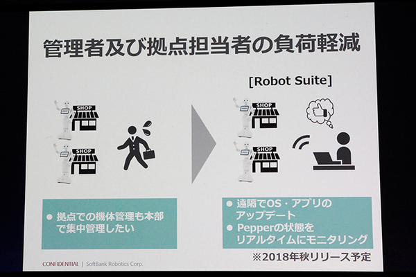 ソフトバンクロボティクスでは、これらの一元管理やPepper個々の機体状況をリアルタイムでモニタリング等ができる「ロボットスイート」を今秋にも公開する予定だ。