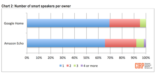 複数台数所有については、Amazon Echoユーザーの34%、Google Homeユーザーの31%が複数所有していると回答。Amazon Echoユーザーの10%は3台以上所有している。