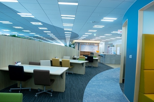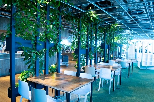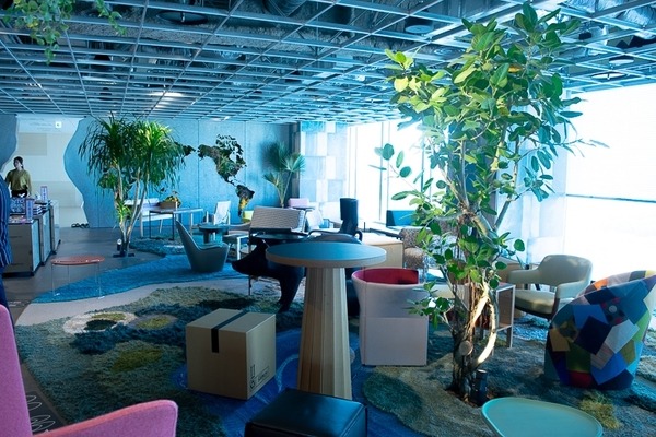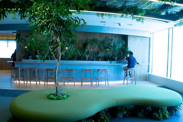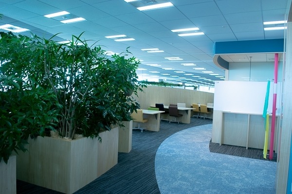 従来の画一的な働き方ではなく、ゆらぎを持たせた、流線型のデザインのオフィス。座席も様々用意されていて、ここでも緑がふんだんに盛り込まれています。働く社員が、家やカフェでリラックスして働くような環境を意識して作られています。