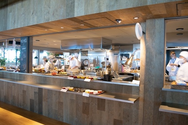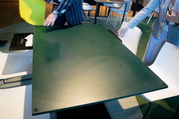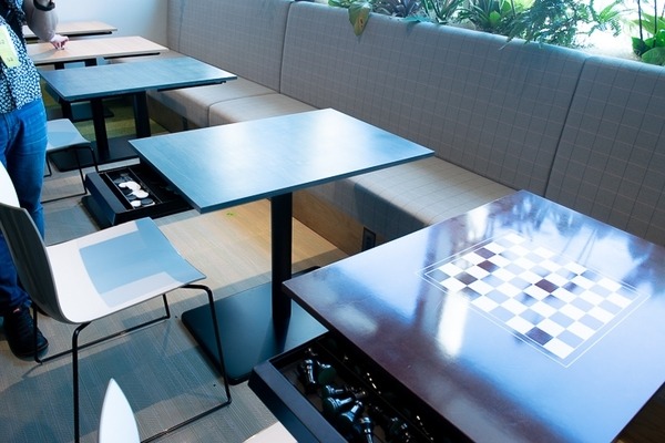 テーブルがチェス盤になっていました。隣にはオセロ・将棋盤もあり、それぞれ駒などもテーブルの引き出しに入っています。楽しくランチをしてもらいたいという意図で置かれているとのことです。
