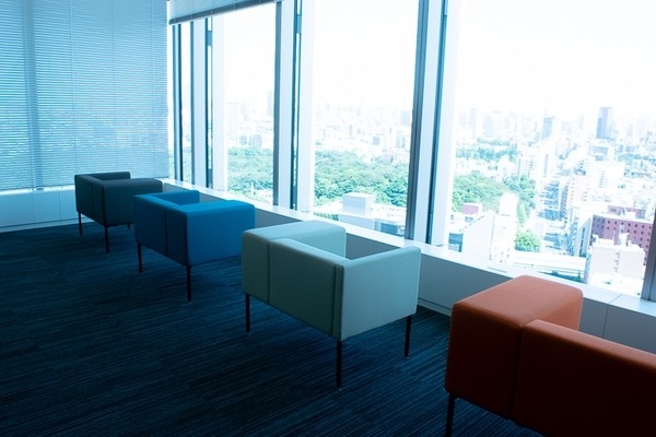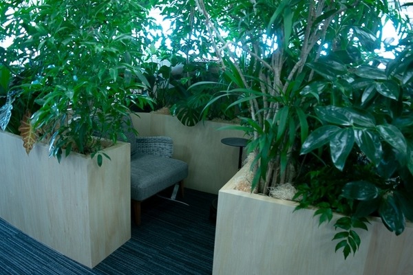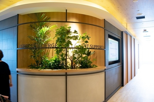 同じく21階フロアの待合スペース。オフィス全体に通していえますが、植物がたくさんある優しい印象のオフィスです。植物はオフィス全体で600種以上があるそう。