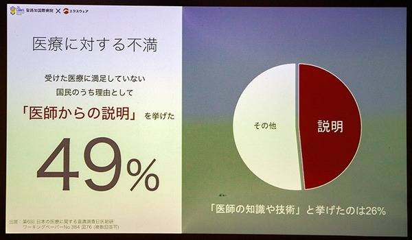 「医療をサービス業にあてはめて考えた場合、これは由々しき事態。提供しているサービスそのものよりも、その説明に課題があるということに等しい」とした。更にそれを掘り下げると「病院の待合室で長時間、待たされた挙げ句、ようやく自分の診察になったと思ったら、医師からの説明が3分で終わってしまう、こんな現状であれば不満を持って当然。これは同時に待ち時間が長すぎるという課題もある」と続けた。