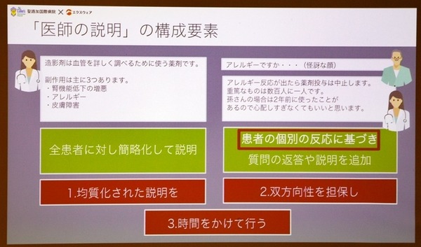 例えば「造影剤検査」の説明を行う際、医師が説明した「アレルギー」という言葉に患者が反応した場合は、”その反応に基づいて”アレルギーに関わる説明を追加したり、患者の心配や疑問を取り払う説明を丁寧にしていく、ということ。