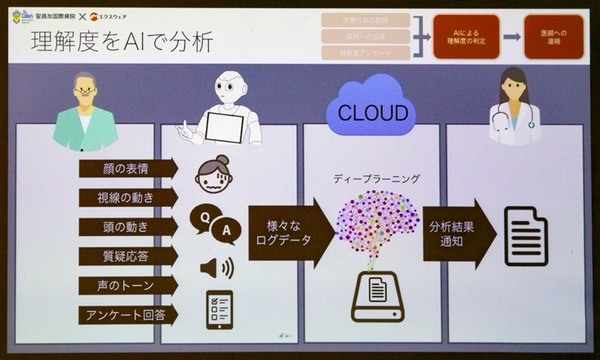 アンケートにはやはり同社がリリースしている「MOMONGAプラスアンケート」を活用する。最後の仕上げとして、Pepperが患者の反応をより微細に把握するための技術が提案された。Pepperは医療行為の説明や質疑応答、アンケートなどを通して、患者の顔の表情、視線の動き、頭の動き(うなづく/首をかしげる)、声のトーンなど、様々なログデータを、クラウド上のディープラーニングで機械学習したシステムが分析し、その結果を医師に通知する。医師はこうした情報によって患者の反応を理解し、双方向性を担保しつつ、ロボットの導入による自動化、医師からの説明時間の削減を目標に掲げる。