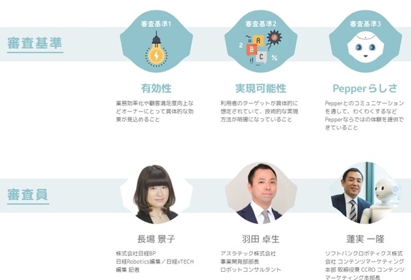 「Pepper Owners Challenge 2018」では審査基準として、「有効性」「実現可能性」そして「Pepperらしさ」の3つが掲げられている。審査員は、日経BPの長場景子氏(日経Robotics編集/日経xTECH編集 記者)、アスラテックの羽田卓生氏、そしてソフトバンクロボティクスの蓮実一隆氏の3人がつとめた。