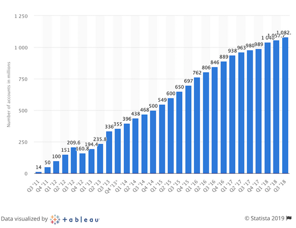WeChatの最大の特徴はユーザー数が大きいことだ。2011年第3四半期からの成長グラフを見るとその伸び方も驚異的だが、2018年第1四半期以降、10億を超えるユーザー数を維持している。まさに世界有数の巨大なプラットフォームになっている(ただし、WeChatは暗号化などのセキュリティ面で辛辣な評価を受け、中国国内でも企業が使用を禁止したり、ユーザー離れの傾向が見られるという報道もある)。