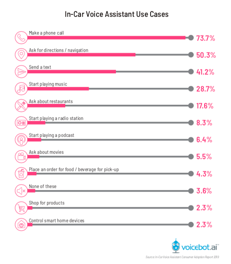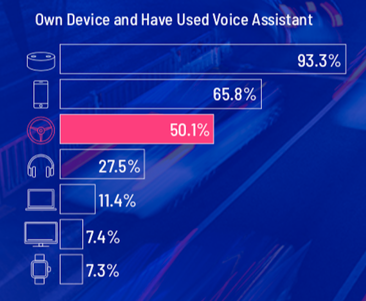 米Voicebot.aiが2019年の車載音声アシスタントに関するレポートを発表した。米国成人1,040人を対象にしたアンケートで、車内での音声アシスタントの利用動向をまとめたものだ。米国成人の自動車所有率は90%。運転中に目と手は使えないため、家庭内よりも車内のほうが音声アシスタントは重要な役割を果たすと考えられている。
