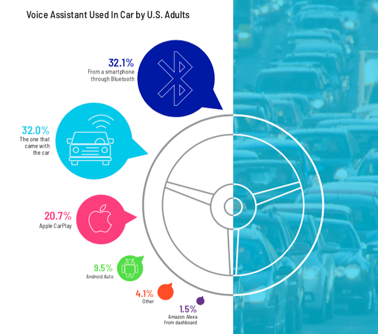 では車内で、どのようにして音声アシスタントを利用しているのだろうか。同調査によれば、車載システムをBluetoothでスマートフォンと接続するケースと、もともと車載されていたケースが30%を超えている。そして「Apple CarPlay」(20.7%)、「Android Auto」(9.5%)と続いた。