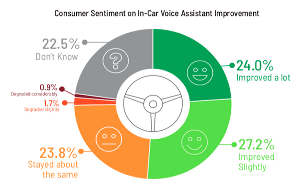 車内音声アシスタントは過去2年で半数以上が改善されたと回答。パフォーマンスが低下したと感じたのはわずか2.8%だった。