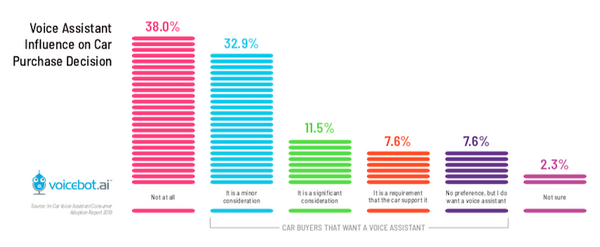 では音声アシスタントは車選びにどの程度影響しているだろうか。自動車購入者の約60%が音声アシスタントの存在が重要であると回答。さらに5人に1人の自動車購入者が、好きな音声アシスタントが使えるかどうかが重要な検討事項または要件となっていると回答した。これは自動車メーカーにとっては驚くべき結果だろう。