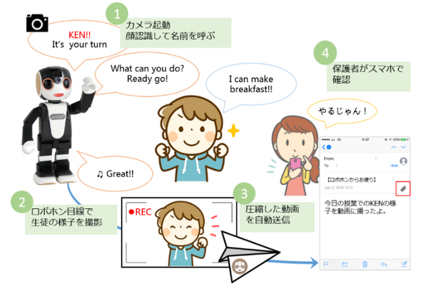 授業の様子をロボホンのカメラで撮影した動画を、親にメールで通知することができる。15秒程度だが、子どもとロボホンの英語会話のやり取りを記録し、あらかじめ設定した親のメールアドレスに送信する。保護者がスマートフォンやタブレット等に届いたメールの動画を見て、子ども達がどれくらい英語学習に取り組んでいるのか、ちゃんと会話ができているのか、授業中の子どもの様子を確認することができる。