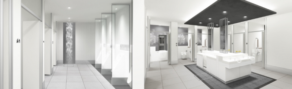 このトイレ空間には、正面壁面(ファサード)に設置した4枚の大型液晶パネル、NTT東日本・バカン・TOTOの共同企画による、「experience TOTO」専用の「タブレットリモコン」そして、IoTを活用したリアルタイムのトイレ混雑状況の確認、清掃器具のモニタニングといった様々な技術が導入されている。