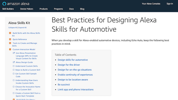 自動車向けAlexaスキルを開発するデベロッパー向けに、ベストプラクティスを例示したドキュメントが公開されている。