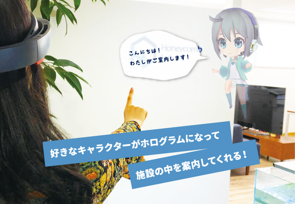 Holo Attendantは、Microsoft HoloLensを用いたシステムで、現実空間をホログラムのキャラクターが案内してくれるというもの。商業施設、美術館など特定の現実空間や、特定の場面(工場見学、会社案内など)に対して、Web上の設定画面から案内させたい地点や内容を設定することで、任意のキャラクターが現実空間を案内してくれる。