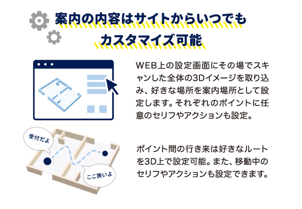 設定画面では、HoloLensによって3Dスキャンした「案内したい現実空間」を取り込み、スキャンイメージの中で好きな場所をいくつも案内場所として設定することができる。また、各ポイント毎に任意のセリフやアクションを設定したり、ポイント間の移動ルートを指定、作成したりすることも可能。