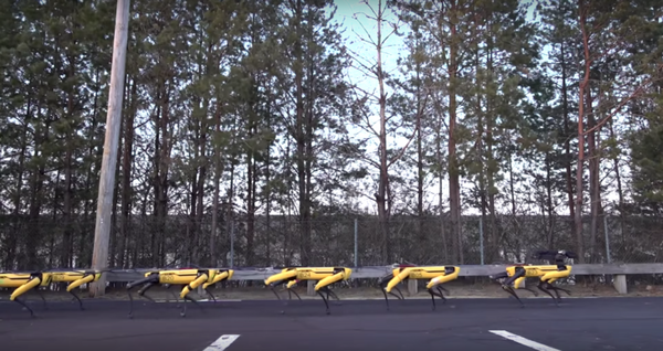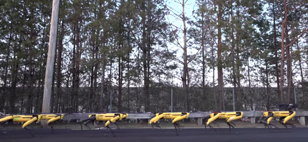 動画の冒頭では、ただただ複数体のSpotMiniが歩いているように見えるが、
