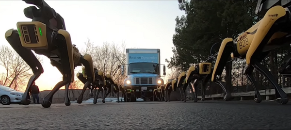 ボストン・ダイナミクスが新たに公開した動画は、10体のSpotMiniがトラックを引く動画だ。