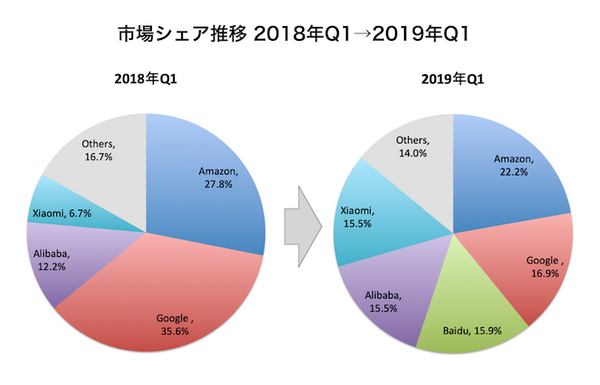 国別でみると中国は2019年第1四半期に前年同期比で500%近く成長し1,060万台に達した。結果、米国を抜いて世界最大のスマートスピーカー市場となった。中国の増加は、各ブランドが派手な販促キャンペーンでシェア獲得を進めたことによる。米国は2018年Q4の44%から2019年Q1で24%に相対的に低下した。