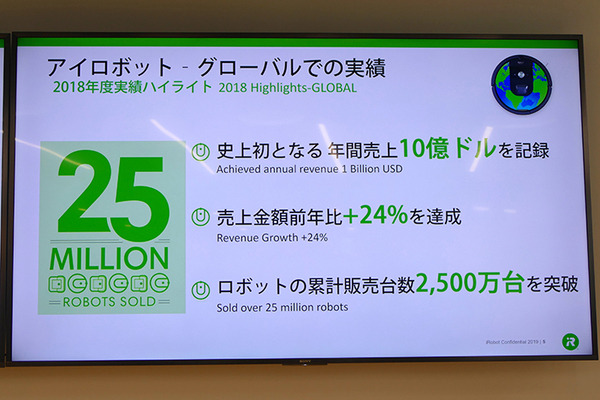 アイロボットジャパン合同会社 代表執行役員社長の挽野元氏は会見で、アイロボットグローバルでの実績を改めて示した。アイロボットは2018年度、史上初となる年間売上10億ドルを達成。売上金額は前年比+24%。ロボットの累計販売台数は2,500万台を超えた。