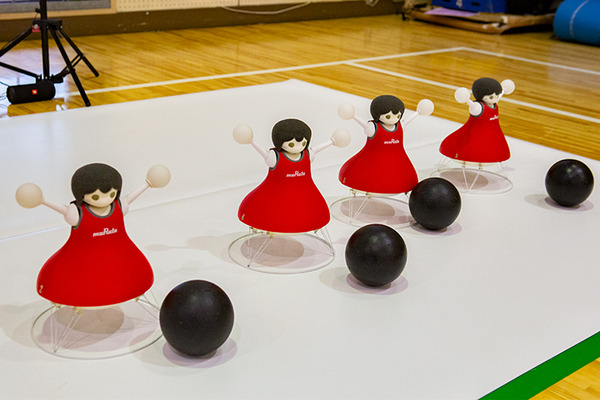 「倒れそうで倒れない」「ぶつかりそうでぶつからない」、そんな応援ロボットが「村田製作所チアリーディング部」だ。本来は10体(10人)で1グループのチームだが、小学校出張授業ということもあり、限られたスペース用に今回は4体組でチーム・パフォーマンスを披露してくれた。
