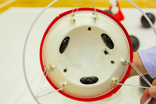 黒い球は鉄製だが、中は空洞で軽い。球にはゴムのスプレー塗装が施されていて、滑り止めになり、「動く」「止まる」を正確にこなすのに役立っている。