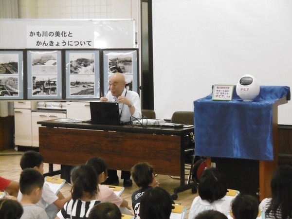 そして、今年「タピア」との出会いがあり、子供達に環境学習のサポート役としてデビューしました。授業の始めに子供達に、「今日は君たちからの質問について『ロボットのタピア』がお答えしますので静かに聞いて下さいね!」と説明。そして、タピアが話し出すと子供達は熱心に聞き入り、メモをしていました。今後は、様々な内容を入力し、タピアを環境学習に活用したいと思います。