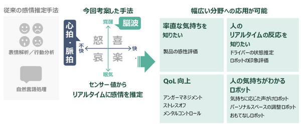 同手法は、覚醒・眠気と快・不快の2軸上に感情分類を行う心理モデルにもとづき、脳波、脈拍・心拍などの生体計測により感情を推定するもので、生体計測値を用いることにより、リアルタイムに人の状態である感情を推定できるようになる。