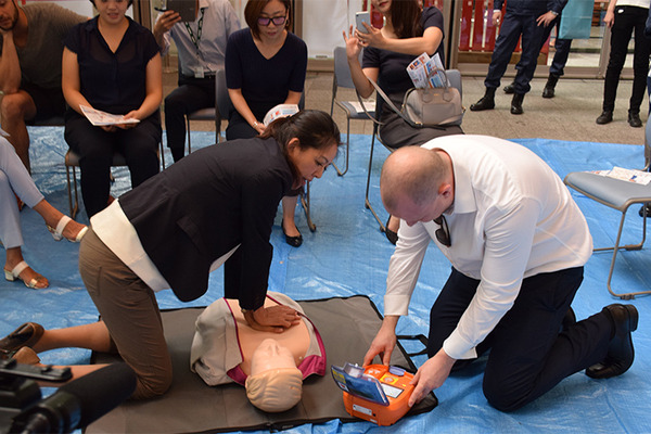 大手町パークビルに 2019年8月29日より本導入した自律走行可能な警備ロボット「SQ-2」を非常時にも活用する訓練を行った。通常の警備を行っている状態から仮救護所に自律走行させ、仮救護所において、トリアージ後の負傷者のサポートをロボットに搭載の通話・カメラ機能を通じた遠隔での英語対応で行うもの。