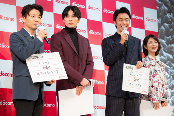 「星プロ」とは、ドコモの新シリーズCM。メンバーは星野源さん、新田真剣佑さん、長谷川博己さん、浜辺美波さんのこと(以下敬称略)。様々なキャラクターが集まる町“キャラまち”が舞台で、プロデューサー(星野源)と、いまいち人気の無い3匹のキャラクター、ドニマル(新田真剣佑)、コスモフ(長谷川博己)、モンジュウロウ(浜辺美波)が登場する(頭文字はドコモ)。