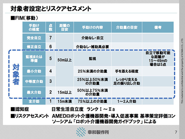 対象者は日常生活動作を測る指標であるFIM(Functional Independence Measure)スケールを用いて想定し、15m-50m程度歩ける人とした。7段階ある認知症高齢者の日常生活自立度においてはランクI~IIa(ほぼ自立している、多少困難があっても周囲が注意していれば自立している)とした。リスクアセスメントは、産総研の研究成果の一つである、AMEDロボット介護機器開発・導入促進事業基準策定評価コンソーシアム 「ロボット介護機器開発ガイドブック」 に基づいた。